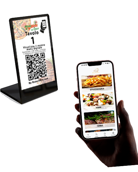 Menu digitale completamente personalizzabile visualizzabile tramite scansione QR Code , NFC o Link .