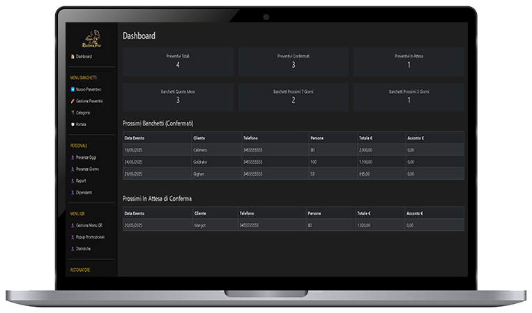 RistoraPro è il gestionale completo pensato per semplificare ogni aspetto della tua attività: dal menu digitale alla gestione del personale, fino alla creazione di preventivi professionali per ogni evento, comunioni, battesimi, matrimoni, feste di laurea, compleanni, ecc.