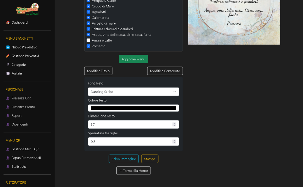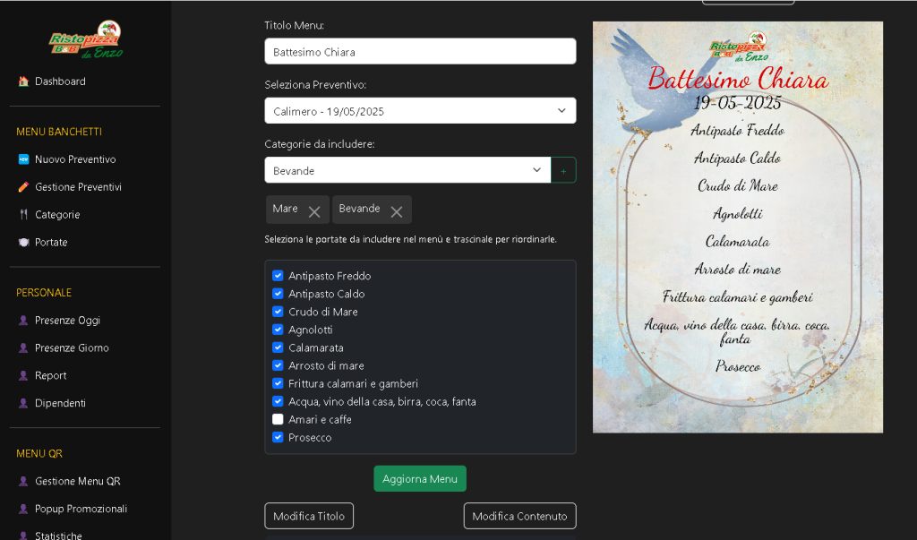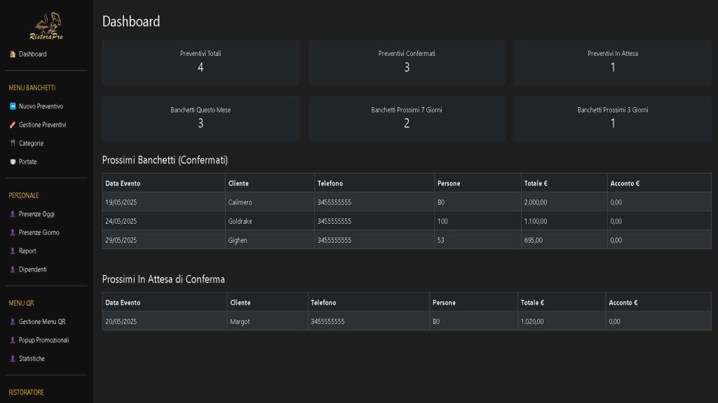 • Accesso rapido: pulsanti verso sezioni principali (nuovo preventivo, presenze, menu QR, popup)