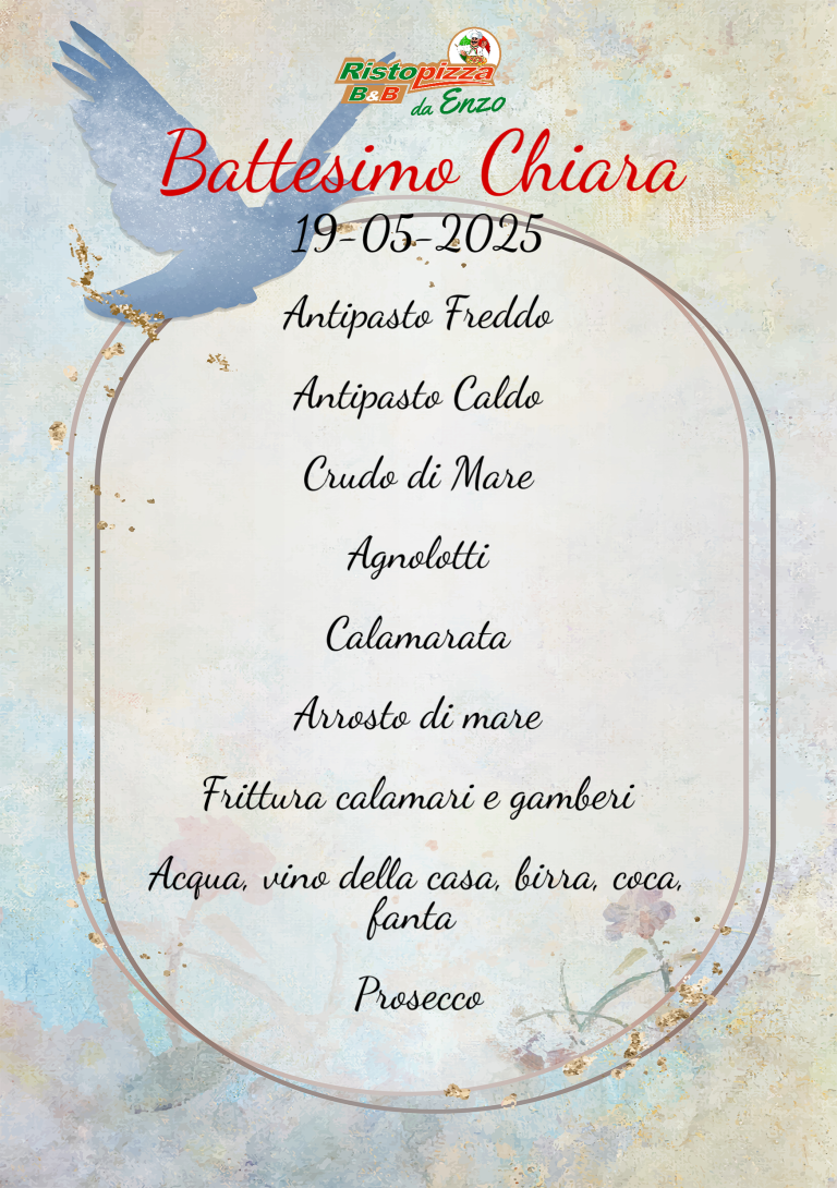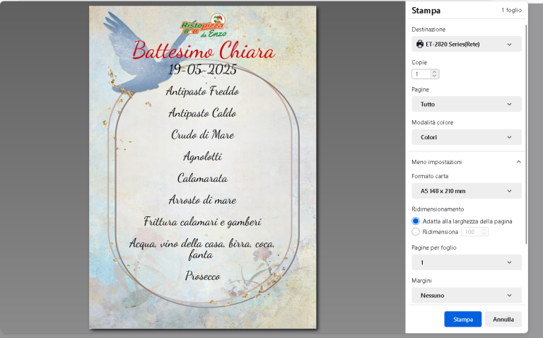 In questo esempio, è stato creato un menu per il “Battesimo di Chiara” con personalizzazione di titolo, portate, font e template di sfondo