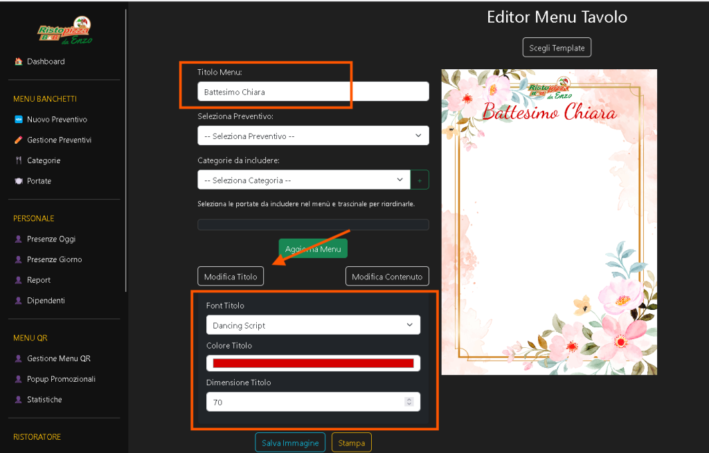 Nel campo Titolo Menu, scrivi il nome dell’evento (es. “Battesimo Chiara”). Cliccando su Modifica Titolo puoi cambiare font, colore e dimensione:
